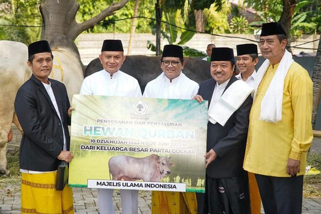 JAKARTA – Ketua Umum Partai Golkar, Airlangga Hartarto, menyumbang seekor sapi kurban berbobot 1,2 ton kepada Majelis Ulama Indonesia (MUI) Pusat. Momen istimewa ini berlangsung setelah pelaksanaan salat Idul Adha di Kantor DPP Partai Golkar, Jakarta, pada Kamis (29/6/2023).